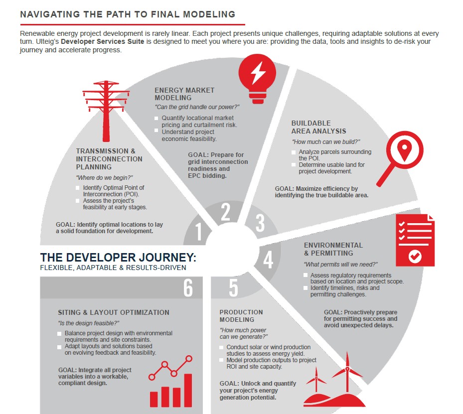 Navigate complex regulatory frameworks while managing interconnection, siting, and environmental requirements: Ulteig’s Developer Services Suite pairs industry insights with a comprehensive technology solutions bundle designed to enhance project outcomes.